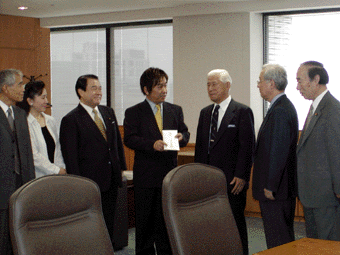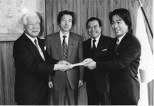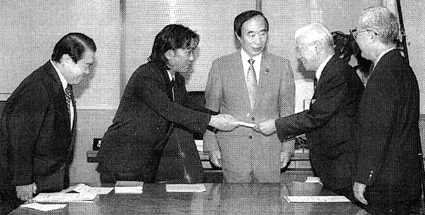| 1997年8月に“AYAKA基金”で集った真心の募金を、小泉厚生大臣(当時)に届け、難病撲滅へ向けての熱い思いを伝える。その後も、2000年には津島厚生大臣(当時)、2001年、2002年、2003年には坂口厚生労働大臣に募金を届け、一人一人の小さな真心を大きな、現実の力と変えている。 |